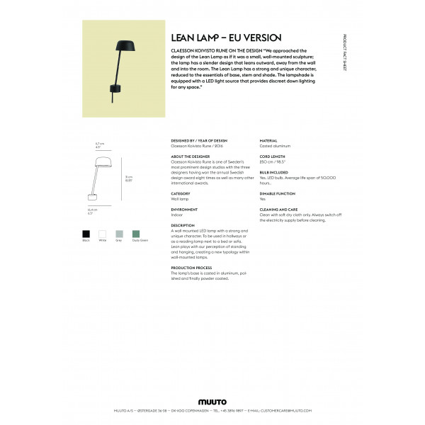 Not yet rated | create your own review. With a slightly leaning body and cupped shade over its led light, the lamp is both sleek and playful in the tradition of functional scandinavian lighting. The lean can be installed any where in the house emitting a soft down light. Always switch off the electricity supply before cleaning. The lamp arm is slightly diagonal, seemingly leaning away from the wall into the room, spreading a soft light. 0 of 5 stars 1 reviews. Designed by claesson koivisto rune the lamp leans outward, away from the wall and into the room. The lean wall lamp is based in the scandinavian design tradition but with a little twist. Made to be used in areas such as hallways, or as a reading lamp positioned alongside a bed or a sofa. Perfect for rowing up in a hallway or as a small reading light next to a bed or a sofa setting. Muuto lean wall lamp, in stock. Designed for muuto by claesson koivisto rune, one of sweden's most accomplished design studio's, lean is a unique wall mounted led lamp, that can be used in hallways or as a reading lamp next to a bed or sofa. 11.7 x 16.4 x 31 cm.